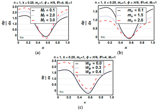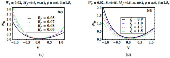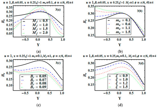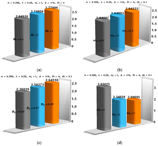 The influence of is analyzed through Figure 6a–c and Figure 7a–d to peruse the pressure gradient and rate of heat transfer. Figure 6a reveals that for the increasing value of the Hartman number, the pressure gradient decreased at the narrow part, whereas it increased at the wider region. Figure 6b depicts the influence of the Hall parameter. decreased at the wider region, and a negligible difference was observed at the narrow part. Figure 6c portrays that with the increase of the Weissenberg number, the pressure gradient increased at the narrow and wider region. Figure 7a,d presents that for higher values of the Biot number and Hall parameter, the heat transfer rate reduced; whereas the heat transfer rate increased for the Brinkman number and Hartman number (Figure 7b,c).