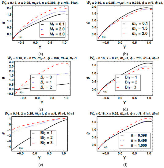 Figure 4a–f shows the behavior of temperature for different physical parameters, particularly the Hartman number Hall parameter Brinkman number , power law index (n), and Biot numbers Figure 4a depicts that the temperature profile gradually rose for increasing values of the Hartman number . Basically, magnetic field lines interacted electrically with the fluid and produced Lorentz force. Lorentz force retarded the fluid motion (transforming the kinetic energy of the electrically conducting fluid to heat energy), and fluid temperature rose. It is found from Figure 4b that the temperature is lowered because of the increase in the electrical conductivity of the fluid. Figure 4c elucidates that under the influence of the Brinkman number, the temperature rose. The reason behind this is that for a large value of the Brickman number, the frictional force increased (due to the collision of fluid molecules with each other), and as a result, kinetic energy converted into thermal energy, implying a rise in total fluid temperature. The influence of the Biot number on the temperature is presented in Figure 4d,e. Temperature decreased at the upper wall by the increase of , and it had no visible effect on the lower wall. In contrast, the temperature escalated at the lower wall with the increase of , and a negligible difference was observed on the upper wall. In most of the cases, for small Biot numbers, temperature uniformly distributed inside the fluid, whereas for Biot numbers greater than 0.1, irregularity resulted. Therefore, we tool a special case for a large value of the Biot number. Figure 4f elucidates that temperature increased for increasing values of the power law index.