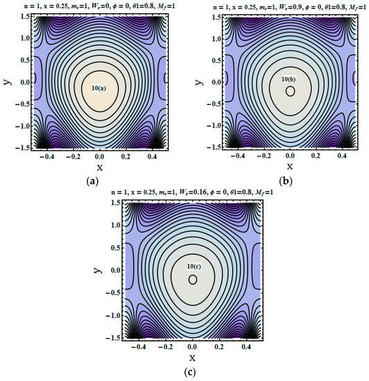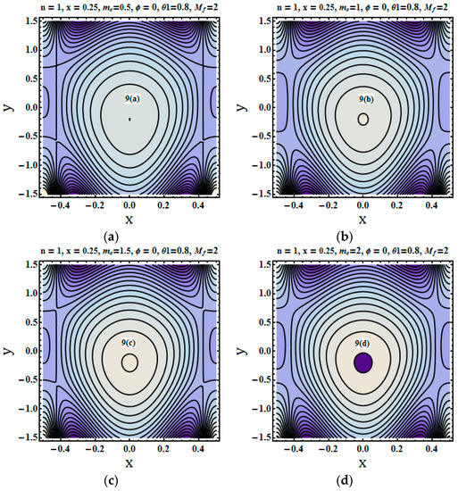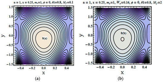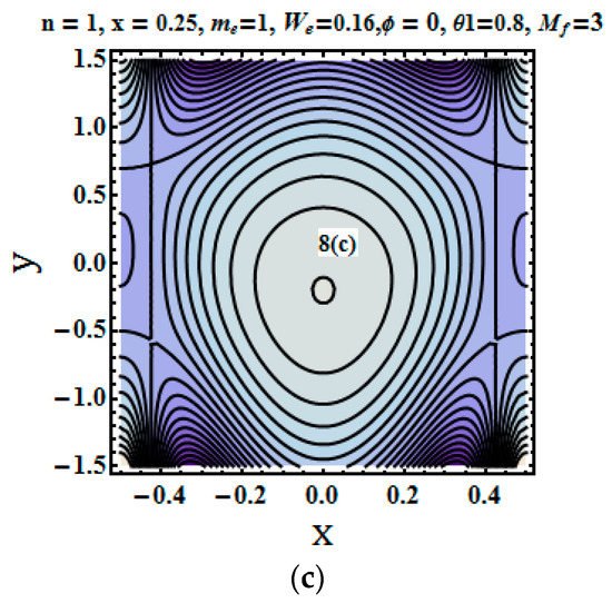 Streams lines were plotted to depict the flow pattern. The trapping phenomenon for fluid parameters (Hartman number), (Hall parameter) and (Weissenberg number) was described through plotting the streams lines. Figure 8, Figure 9 and Figure 10 show that the bolus size decreased for increasing values of the Hartman number and Weissenberg number. Figure 10a–c depict the opposite trend that is for higher values of hall parameter bolus size not only increases but number of closed stream lines also increases in count.