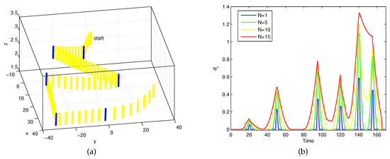 In this section, we are devoted to illustrating the effectiveness of Algorithm 1. First, the simulation of a cylinder motion is provided, and the effects of the window size N are analyzed for the results of the change-point detection. Secondly, the change-point detection experiment is presented, which was carried out using a STAUBERT TX90XL manipulator (Staubli, Faverges, France). Change points of the manipulator’s motion were identified in order to reduce its speed near the change points, so that the manipulator could move smoothly.