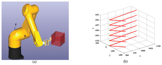 (a) Scanning on the surface of a rectangular workpiece with rounded corners by a STAUBLI TX90XL manipulator; (b) Change points of the motion trajectory.