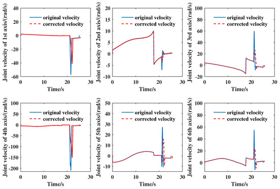 In the practical experiments, each joint velocity was measured based on the data given by each motor encoder. Figure 4 shows a comparison of the original velocity without change-point detection to the corrected velocity for each joint axis. It can be seen that the peak velocity after change-point detection and calibration was significantly reduced. The maximum velocities of joints 2–3 and 5–6 decreased by more than 40%. This application had good performance in smooth transition and stable operation for the manipulator’s control.