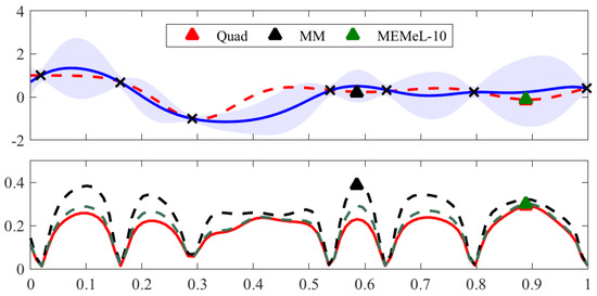 Bayesian Optimisation (BO) on a 1D toy example with acquisition functions computed by different approximation methods. In the top subplot, the red dash line is the unknown objective function, the black crosses are the observed data points, and the blue solid line and shaded area are the posterior mean and variance, respectively, of the GP surrogate that we use to model the latent objective function. The coloured triangles are the next query point recommended by the BO algorithms, which correspond to the maximiser of the acquisition functions in the bottom subplot. In the bottom plot, the red solid line, black dash line, and green dotted line are the acquisition functions computed by Quad, MM, and MEMe using 10 Legendre moments, respectively.
