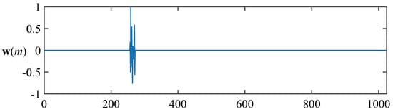 in which represents the characteristic index, which controls the behavior of the impulsive distribution. When parameter is smaller, the impulsive intensity becomes larger. is the symmetric parameter, denotes positional parameter, and represents the dispersion parameter. Furthermore, the -stable distribution is given by . Herein, is chosen to implement the impulsive noise. In all simulation experiments, , and were selected, and the input signal power was 1. The network echo channel used for the experiments, which is classical sparse channel presented in Figure 2, whose active coefficients distributed in , was considered to evaluate the proposed PAPMCC algorithm. The related parameters were set to be and [48]. The performance for all used algorithms was evaluated by normalized misalignment (NM), which is written as .