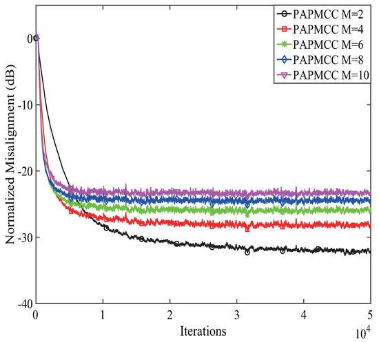 Firstly, the effects of the projection order M on the convergence for the PAPMCC algorithm was investigated. The colored noise, which was obtained from white Gaussian noise (WGN) filtering through an autoregressive with a pole at 0.8, was used as the input signal. Herein, . The results given in Figure 3 point out that increasing the projection order M could speed up the convergence, while the steady-state misalignment was increased. Therefore, a trade-off between the convergence speed and steady-state misalignment should be taken into consideration.