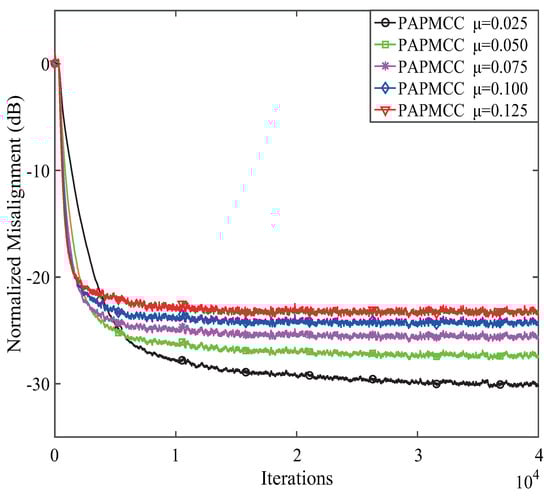 Thirdly, the effects of on the convergence for the PAPMCC algorithm was investigated using colored noise as the input signal. From the above simulation results, was selected, and other parameters were the same as the first experiments, and the results are presented in Figure 5. Parameter controls the convergence speed of the PAPMCC. With the increment of , the normalized misalignment was decreased, while the convergence rate became fast. Consequently, the parameters and are supposed to be reasonably selected in practical application.