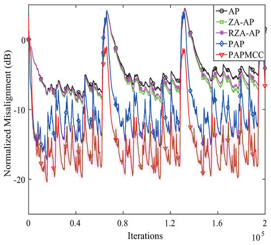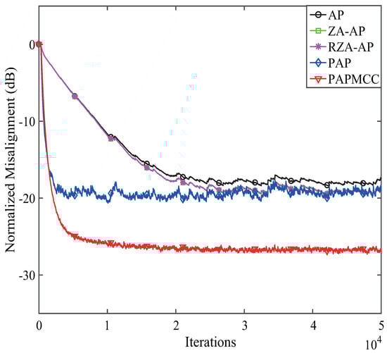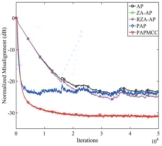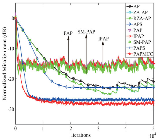 Two conventional robust algorithms were taken into account for comparison to deal with impulsive noise, namely, APS and PAPS algorithms. Herein, the step sizes of the APS and PAPS algorithms were set to 0.005, while the step sizes for the PAP and improved PAP (IPAP) algorithm [49] were set to 0.5, and the bound of set-membership PAP (SM-PAP) algorithm [34] was set to where represents the power of the noise. The other parameters were consistent with the previous simulations. The results presented in Figure 11 indicate that the proposed PAPMCC algorithm could still achieve the lowest steady-state error.