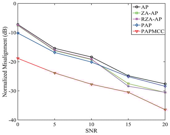 4.3. SNR vs. Normalized Misalignment (NM) of the PAPMCC Algorithm