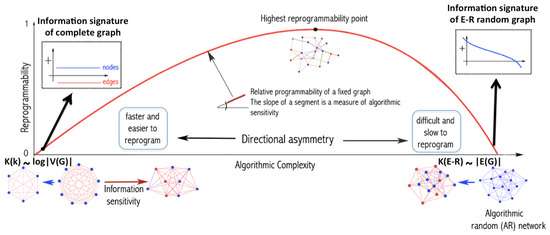 Specifically, if S is a simple graph and R an algorithmically random one, then we have it that , i.e., the rate of change from S to (a non-specific) R is greater than in the other direction, thus imposing a thermodynamic-like asymmetry related to the difficulty of reprogramming one object into another according to its initial program-size complexity. This is because a random deletion to R will always have little impact on the underlying with respect to (of at most logarithmic effect), because R, but a random deletion (or a random transformation in general) to S may lead to a greater disruption of the small (by definition) generating program of S. The asymmetric axis where the highest reprogrammability point can be found is exactly the point at which for a specific S and R.
