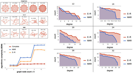 (Top left) One can produce a MAR graph starting from an empty graph and adding one edge at a time (see Figure 6) or one can start from a complete graph and start deleting edge by edge keeping only those that maximise the algorithmic randomness of the resulting graph. (Bottom left) Following this process, MAR graphs top E-R graphs meaning BDM effectively separate low algorithmic complexity (algorithmic randomness) from high entropy (statistical randomness), where entropy would simply be blind collapsing all recursive and non-recursive cases. (Right) degree distribution comparison between E-R and MAR graphs.