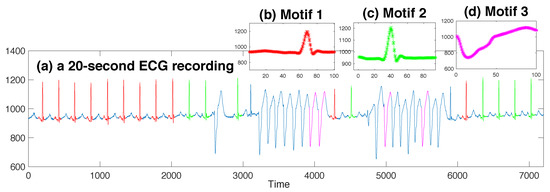 We analyzed the ECG data by identifying motifs with length 100, corresponding to a duration of 0.28 s. In this fairly short recording (see Figure 2a), our algorithm identified three motifs. The first two motifs corresponded to normal heartbeats (highlighted with red and green; templates shown in Figure 2b,c). We can see that their shapes mostly coincide, with a horizontal shift. Normal heart beats are deemed to be similar to each other, but within each one, there may exist a particular subsection that bears more similarity than other subsections. Since the motif length was set to be less than a period of a normal heart beat, our algorithm was prone to regarding those subsections that bore the similarity to a different extent to be in different motif sets. Another motif identified by the algorithm lied in the area of the ventricular tachycardia (pink sections). The instances did not cover all the ventricular tachycardia heart beats, but the small error bars in Figure 2d indicate that these instances were uncannily similar to each other, and the reason why other ventricular tachycardia subsequences lost the membership for this motif set was their smaller similarity.