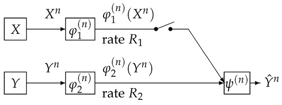 In this figure, the AKW system corresponds to the case where the switch is closed. In Figure 1, the sequence represents independent copies of a pair of dependent random variables which take values in the finite sets , respectively. We assume that has a probability distribution denoted by . For each , the encoder outputs a binary sequence which appears at a rate bits per input symbol. The decoder function observes and to output a sequence , which is an estimation of . When the switch is open, it is well known that the minimum transmission rate such that the error probability of decoding tends to zero as n tends to infinity is given by . Csiszár and Longo [3] proved that, if , then the correct probability of decoding decay exponentially and derived the optimal exponent function. When the switch is open and , Slepian and Wolf [4] proved that is the minimum transmission rate such that the error probability of decoding tends to zero as n tends to infinity. Oohama and Han [5] proved that, if , then the correct probability of decoding decay exponentially and derived the optimal exponent function.