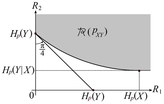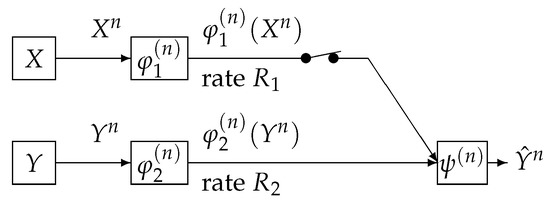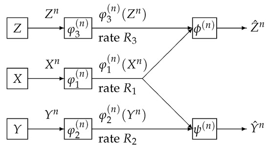 - Ahlswede, R.F.; Körner, J. Source coding with side information and a converse for degraded broadcast channels. IEEE Trans. Inf. Theory 1975, 21, 629–637. [Google Scholar] [CrossRef]
