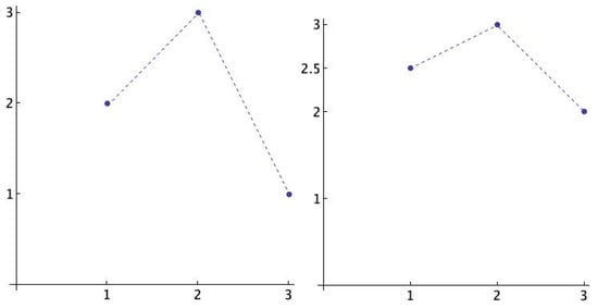 The weighted version of Rényi entropy uses weighted frequencies in which not only the order is considered but also the differences between the values of the pattern. The idea is illustrated in Figure 1. Observe that and are the same pattern, namely , but the distance between the values are different. The definition follows.