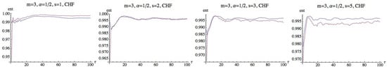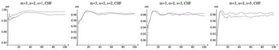 Average Rényi entropy (RPE) (blue) and average weighted Rényi entropy (WRPE) (red) for the CHF group with , , and , and 5. Observe that for , the WRPE is higher than the RPE for most values of . Nevertheless, for the situation changes.