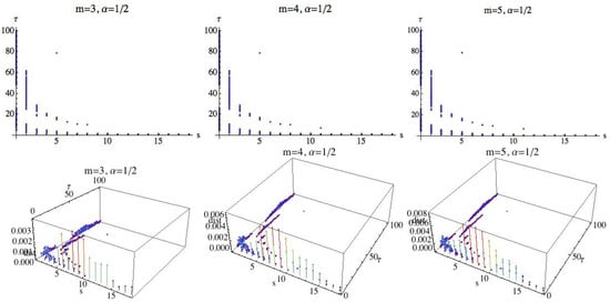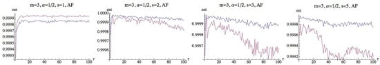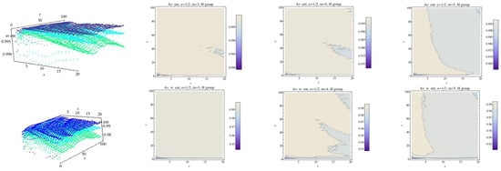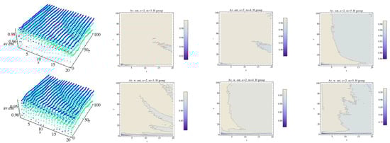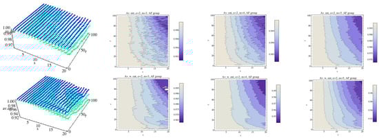 We will investigate the existence of parameter values in which the three groups are differentiated simultaneously. It means that a relationship of order should be given. In addition, in those situations we will compute the difference between and and the difference between and , and we will compute the minimum of both. This value will be called the difference between the three groups. We are interested in finding the parameter values by which the groups are differentiated and the difference is maximal. Observe that although the number of subjects is small, a negative answer to this question also gives valuable information. For this, we fix and consider three different cases: , , and . Figure 16 shows the results for . In 3D graphs (Figure 16), the OX axis represents the parameter s, where , in the OY axis is represented the parameter , , and finally in the OZ axis is represented the difference between the three groups, when the groups are differentiated by MRPE. The 2D graphs show the values for which the three groups are disjoint in the sense described above. Whereas in the 3D plots we can see not only the parameter values in which the three groups are disjoint but also the difference between them. When m changes, the shape of the distribution of the points is similar although the number of points increases, namely for there are 168 points, for there are 283 points, and for there are 348 points. The maximum difference increases with the parameter m, as we can see in Figure 16. The difference attains its maximum values when . The relation of order between the three groups is, in all cases, AF > H > CHF. More details are given in Table 1, where the results for and are shown.