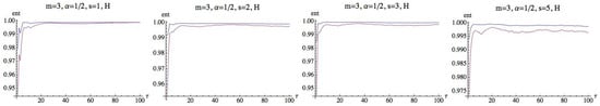 Regarding the relationship between the WRPE and the RPE for a fixed m and , we can observe that it depends on the scale value s; see Figure 5, where the RPE is drawn in blue and the WRPE in red. This relationship can remain unnoticed if multiscale analysis is not involved. Thus, for we can observe that for , the WRPE is greater than or equal to the RPE. Nevertheless, when the order relation changes and there is no rule to determine if an entropy measure is greater than the other one. For values of , the relationship turns around, and the RPE is greater than the WRPE. The limit case and close values of to this gives a different behavior.