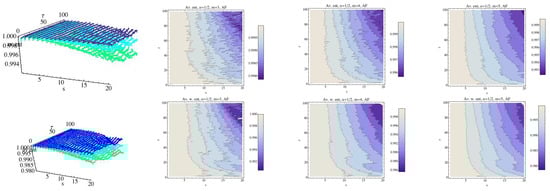 Fixing , values of s and for which the three groups are separated by the MRPE are shown. In the 3D graphs, the OX axis represents the parameter s, where , in the OY axis is represented the parameter , , and finally in the OZ axis is represented the difference between the three groups, when the groups are differentiated by the MRPE.