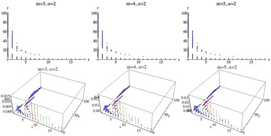 Now we consider a fixed value of greater than 1; we follow with the reference value . Figure 17 shows the results. The shape and the distribution of the points for a fixed embedding dimension is similar to the results obtained for , but we can observe that the maximum difference is greater than the one obtained in the above case.