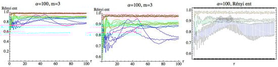 For , we can observe that there is a large quantity of values of for which the three groups are differentiated, although the differences in these values are significantly lower than in the previous case. For , we simply get RPE with delay, , that now runs over a set of cardinality equal to 100. This means that for a fixed m, we have two parameters and . Fixed the embedding dimension , we compute the Rényi entropy for taking values in the interval . Figure 19, Figure 20 and Figure 21 show the results for , , and , respectively. We can see that the AF group has a different behavior from the healthy and CHF groups. It is possible to find values of for which the three groups can be differentiated. More details are included in the Appendix A (Table A1 and Table A2), where different values of have been considered for and . It is observed that when decreases, the entropy values of the different groups are closer.