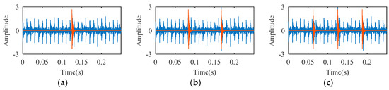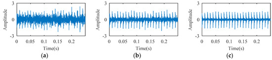 Temporal waveform of simulation fault signal under different signal-to-noise ratios (SNRs): (a) 3 dB; (b) 6 dB; (c) 10 dB.