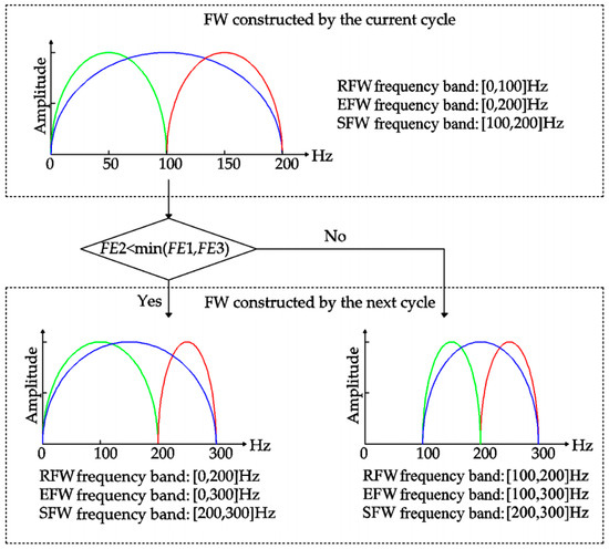 Step 3: The values of FE1, FE2, and FE3 determine the shifting and expanding of the frequency domain window. The relationship of the above entropy values is judged by Equation (15).
