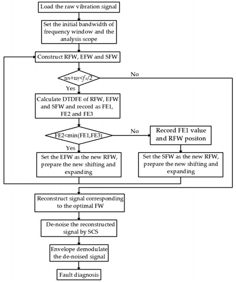 Step 4: Step 3 is repeated until the upper limit of the RFW (i.e., wb + wf) is greater than fs/2. The RFW with the minimum value of DTDFE is the optimal frequency window, the extracted frequency band of which covers the whole resonance band aroused by the bearing fault. That is to say, the reconstructed signal of the optimal frequency window has the most fault information.