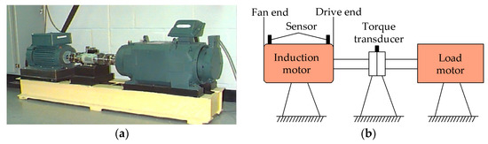 The vibration signals of the SKF6203 ball bearing under outer ring fault are collected from the experimental platform of CWRU. Figure 8a,b describe the photograph and structural sketch of the platform, respectively. Table 1 illustrates the structure parameters of the SKF6203 ball bearing. The acceleration sensors used to acquire the signal are fixed at the fan end and the drive end of the induction motor. In the present paper, the 2048 sample points of the fan-end accelerometer data from the 132nd data file (i.e., OR007@6_3) are selected for analysis. The corresponding defective position, defective diameter, shaft speed, sample frequency, and load are the outer ring, 0.007 inches, 1750 rpm, 12,000 Hz, and 2 horsepower (HP), respectively. The outer ring fault feature frequency fo, i.e., ballpass frequency of outer ring (BPFO) [37], is 105 Hz, calculated using Equation (22).
