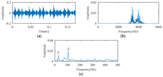 The diagnosis results of AFW: (a) extracted frequency band; (b) temporal waveform; (c) envelope spectrum.