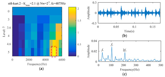 The SCS method is utilized to analyze the ball bearing fault experimental signal, and the analysis result is illustrated in Figure 10. Although the signal temporal waveform becomes sparse in Figure 10, only a spectral line corresponding to fo appears in the envelope spectrum of Figure 10. The spectral lines corresponding to the higher harmonics of fo are absent. Using the AFW method to process this signal, the optimal frequency window is determined adaptively by the shifting and expanding operation, the upper and lower cut-off frequencies of which are 2835 Hz and 4725 Hz. The temporal waveform and fast fourier transform (FFT) spectrum of the reconstructed signal corresponding to the optimal frequency window are shown in Figure 11a,b. The reconstructed signal is demodulated by the envelope operation, and its envelope is obtained as described in Figure 11c. As seen, there are two spectral lines with high amplitude, the frequency of which correspond to 105 Hz (i.e., fo) and 25 Hz (i.e., fr, the rotation frequency). The higher harmonic spectral lines corresponding to fo are still not apparent. The diagnosis results of the SCS and AFW method may lead to misdiagnosis or missed diagnosis. The reconstructed signal obtained by the AFW method is further processed by the SCS method, and the diagnosis results of the AWF-SCS method are described in Figure 12. In the temporal waveform of Figure 12, the signal exhibits more sparsity than that of Figure 10a. In the envelope spectrum of Figure 12, the spectral lines corresponding to the fault frequency fo and its higher harmonic 2fo, 3fo, and 4fo can be clearly seen. In addition, the phenomenon of rotation frequency modulation is obvious, and the spectral lines corresponding to the sidebands of fo and 2fo (i.e., fo ± fr, 2fo ± fr) are also quite apparent. According to these results, the fault type can be definitively identified as an outer ring fault. For comparison, the Fast Kurtogram (FK) method [14] is used to process this ball bearing experimental signal. In the kurtogram of Figure 13, the resonance band determined by FK is marked by a red line, and the temporal waveform and envelope spectrum of its corresponding signal are illustrated in Figure 13b,c. As seen, the spectral lines corresponding to fr, fo, and 2fo can be seen.