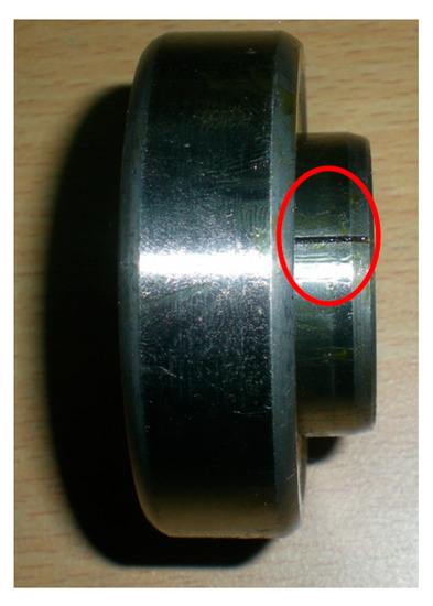 The vibration signals of the N205 cylindrical bearing under inner ring fault are collected on the QPZZ-II fault simulation platform for rotating machinery of the NCEPU. An eddy current sensor is used to acquire data. Figure 14a,b show the physical photo and the structural sketch of the QPZZ-II platform, respectively. The defective bearing is installed at the right bearing block. Table 2 illustrates the structure parameters of the N205 cylindrical bearing. To obtain the bearing vibration signal under an inner ring fault running station, a defect with a width of 0.2 mm and depth of 0.1 mm on the inner ring surface is machined using electric discharge machining technology, the physical photo of which is shown in Figure 15. Throughout the entire process of the experiment, the shaft speed, the sampling frequency, and load are set as 1440 rpm, 12,800 Hz, and 0 HP, respectively. The inner ring fault feature frequency fi, i.e., ballpass frequency of inner ring (BPFI) [37], is 172 Hz, calculated using Equation (23).