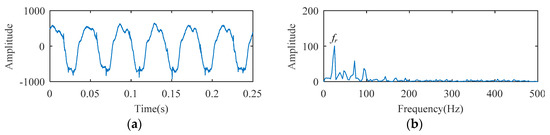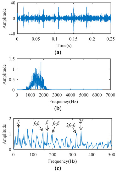 The temporal waveform and envelope spectrum of the cylindrical bearing fault experimental signal are described in Figure 16. As shown in the temporal waveform of Figure 16, six similar local waveforms appear in 0.25 s. This signal can be considered as a harmonic signal, the period of which is 0.041 s (0.25/6 ≈ 0.041). In the envelope spectrum of Figure 16, the spectral line corresponding to 24 Hz (i.e., fr, the rotation frequency) can be clearly seen, but the fault frequency cannot be detected. Fault characteristics are submerged by the rotation frequency carrier signal.