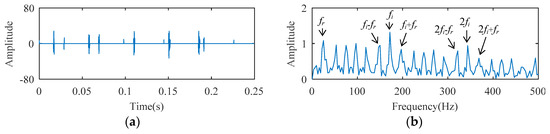 The cylindrical bearing fault experimental signal: (a) temporal waveform; (b) envelope spectrum.