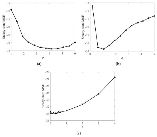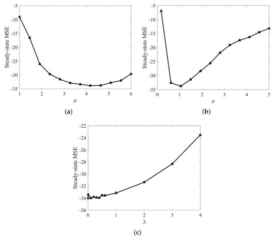 Similar to MG chaotic time series prediction, the influence of power parameter p, risk-sensitive parameter , and kernel width on the performance of RMKRP is also discussed in nonlinear system identification. The influence of p on the steady-state performance of RMKRP is shown in Figure 4a, where the steady-state MSEs are obtained as averages over the last 100 iterations. The parameters are set as: p is set within ; is set as ; and ; kernel size in the KRP is set as 1. The influence of on the filtering performance of RMKRP is shown in Figure 4b, where risk-sensitive parameter is fixed at ; lies in ; p is set as 4. The influence of on the filtering performance of RMKRP is shown in Figure 4c, where the range of is selected as ; is set as 1; p is set as 4. As can be seen from Figure 4, we can obtain the same conclusions as those in Figure 2.