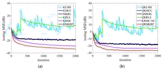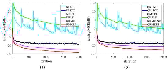 Comparison of the MSEs of KLMS, KMCC, MKRL, KRLS, KRMC, and RMKRP in MG time series prediction (a); comparison of the MSEs of QKLMS, QKMCC, QMKRL, QKRLS, KRMC-NC, and QRMKRP in MG time series prediction (b).
