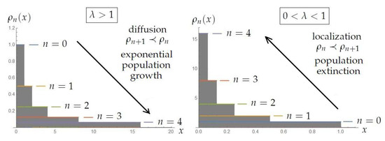 Let us illustrate the localized () and diffusive () behaviors of the probability distributions when the evolution is given by the Frobenius–Perron operator in Equation (19) with a concrete example. We consider that our ignorance about the initial population is given by a uniform distribution along the interval . Here, the dimensionless variable x represents the fraction of individuals with respect to a maximum allowed number of individuals M. We denote as , which represents the probability distribution of the population after n time steps. Using Equation (19), we obtain