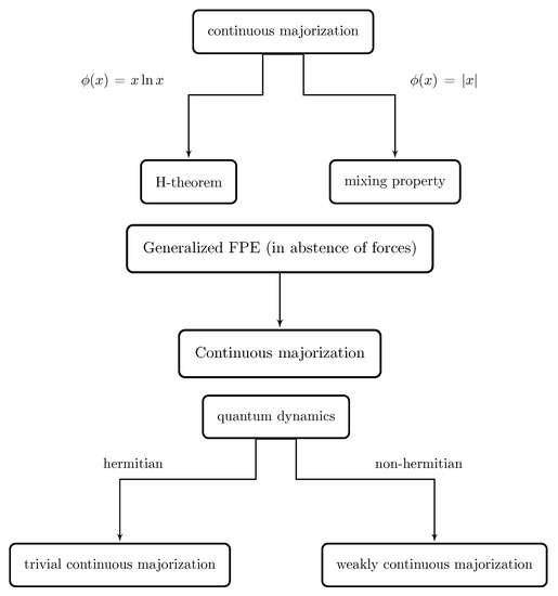 After this characterization of a continuous dynamics by means of continuous majorization, we have analyzed some different examples. Specifically, under the assumption of a dynamics satisfying continuous majorization (condition of Lemma 2), the H-theorem has been obtained as a special case by choosing the convex function (Theorem 4). Analogously, the mixing property in dynamical systems has been obtained by assuming a dynamics satisfying condition and choosing . For the case of the Curado–Nobre generalized FPE in absence of forces, we have shown that the set of solutions indexed by the time constitutes an ordered chain by continuous majorization. Last, we have explored the quantum dynamics generated by the probability distributions given by the eigenfunctions in terms of continuous majorization. In this case, we have found that the Hermitian (unitary) case corresponds to the trivial order while the non-Hermitian (non-unitary) case gives a non-trivial order.