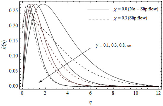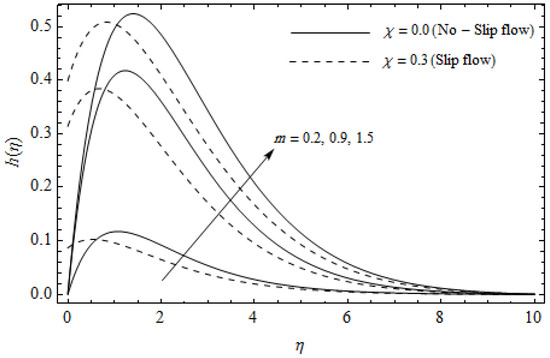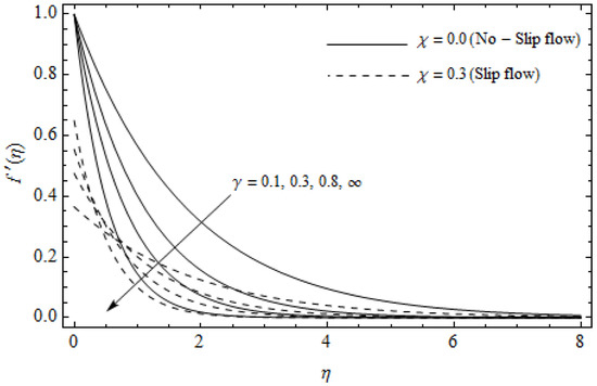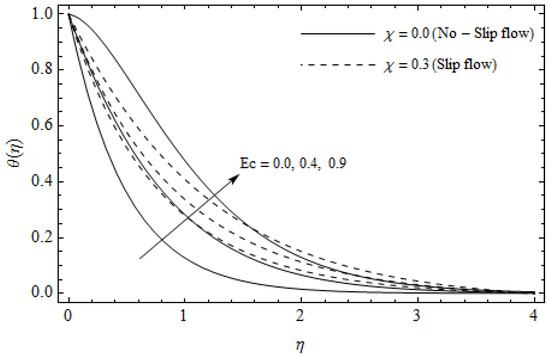 Table 1 and Table 2, are constructed to display the numerical values of skin-friction and , as well as the heat transfer coefficient for various values of the magnetic parameter , Hall parameter , Eckert number and slip factor for both cases of Newtonian () and Casson flows. It is noticed that the magnitude values and enhance gradually for rising values of whereas the reverse scenario is noticed for in both cases. Physically, increasing the magnetic parameter generates an electromagnetic force which depreciates the heat transfer rate while it augments both the magnitude values of the friction factor within the boundary layer. The values of and augment with increasing whereas the reverse scenario is noticed for the magnitude values of for both cases. This is due to the fact that the electrical conductivity of the fluid declines with rising m which eventually dwindles the magnetic damping force. This serves to boost and , but on the contrary, the magnitude values of reduce. From Table 1 and Table 2, the values of boost whereas the coefficients and are insensitive for rising for both cases. Physically, the higher values of Eckert number Ec retard the fluid flow adjacent to the stretching surface. This agrees with the fact that the temperature distributions are enhanced with an increase in Ec as shown in Figure 5. Both the magnitude values of the friction factor and as well as the heat transfer rate reduce with increasing . Physically, with an increase in generates a resistive force neighboring to a surface which declines the physical quantities , and . For Casson flow, the values of skin-friction and and the heat transfer coefficient are more pronounced for all the previous physical parameters than Newtonian flow.