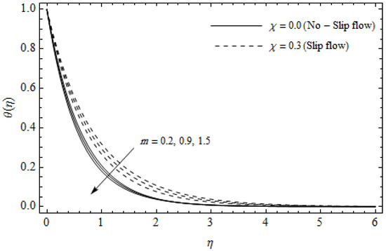Temperature profiles for different values of Hall parameter m and slip parameter with = 0.3, , m = 0.5, Ec = 0.0 and Pr = 2.