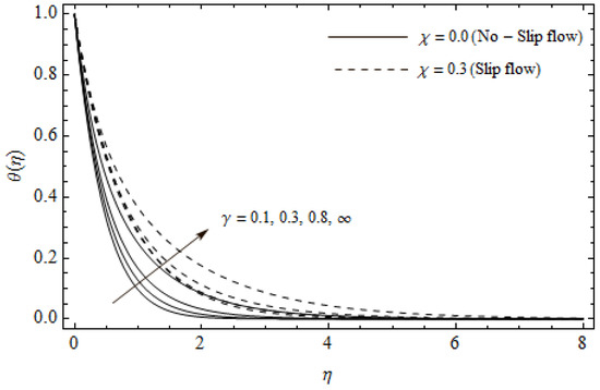 Temperature profiles for different values of Casson parameter and slip parameter with M = 3, m = 0.5, Ec = 0.0 and Pr = 2.