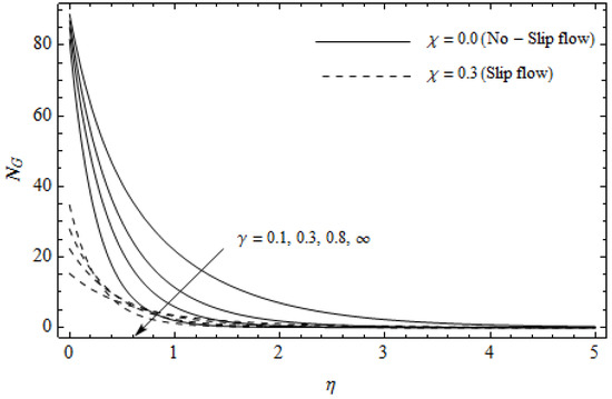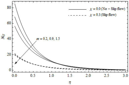 Figure 12, Figure 13, Figure 14, Figure 15, Figure 16 and Figure 17 portray the impact of pertinent parameters on the entropy generation. The influence of the Casson parameter and slip factor on the entropy generation is depicted in Figure 12. It is evident that an elevation in Casson parameter and slip factor diminishes the entropy generation gradually. We noticed that in the case of no-slip () is greater than for the slip case (). Figure 13 exhibits the variation of entropy generation with the magnetic parameter and slip factor . From Figure 13, the entropy generation is an enhancing function of whereas it is a decreasing function of . Physically, an increase of generates a Lorentz force which increases the entropy production rate. This phenomenon shows that the magnetic force is a key principle in the entropy generation. Furthermore, the entropy generation profile for the case () is more than that for the case (). The entropy generation reduces with an increase of which reveals the system is cooling down. In Figure 14, the variations in the entropy generation profile are depicted for various values of Hall parameter m and slip factor . It is seen that the increase of m and decreases the entropy generation at the sheet nearby. This is due to the fact that the Hall current has considerable effects on Lorentz force term and current density. Consequently, increasing m augments effective electric conductivity which in turn depreciates and as depicted in Figure 8. Further, the case of () shows more impact on the entropy generation compared with the case (). Figure 15 portrays the influence of Eckert number and slip parameter on the entropy generation . It is interesting to see that enhancing values of reduce near the surface and then rise in the region far away from the surface. For the case (), the entropy generation is more pronounced with a rise in than the case (). Figure 16 illustrates the impacts of Reynolds number and slip parameter on the entropy generation . It reveals that is an increasing function of . On the contrary, increasing values of reduce . Physically, the Reynolds number is represented by the ratio of inertial forces and viscous forces. Higher values of Reynolds number show the dominance of inertial forces which causes an enhancement in the entropy production. Further, it is remarkable that is higher in case () than that in the case (). Figure 17 is displayed to show the impact of group parameter and slip parameter on the entropy generation . From this figure, it is detected that boosts with an increase in . However, the scenario becomes different with an increase in within the boundary layer region. Physically, increasing promotes the viscous effects of the fluid, which causes the entropy generation to enhance. The group parameter has a vital role to maximize the energy which measures the ratio of viscous effects and thermal asymmetry. On the other hand, it is noticed that the entropy generation is minimized with rising slip factor . This is due to the fact that the friction between the stretching surface and the fluid dwindles with an increase in .