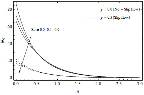 Effect of Eckert number and slip parameter on entropy generation with = 0.3, , , Pr = 2, and .