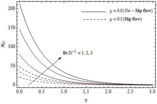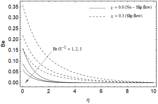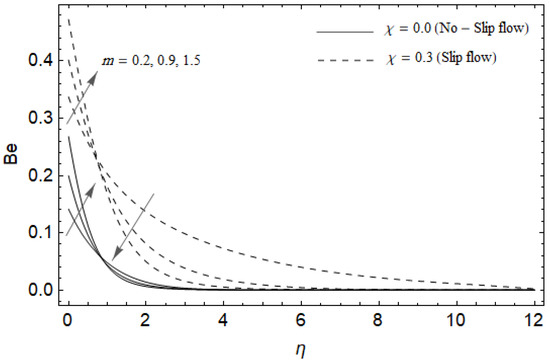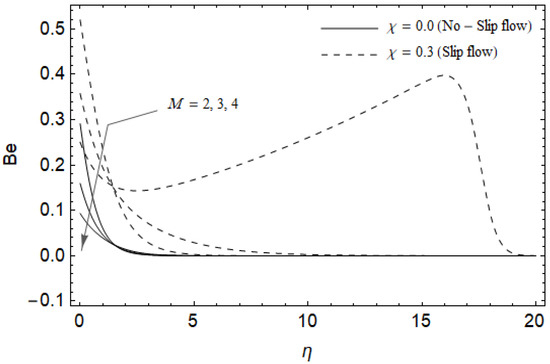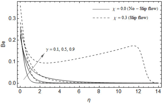 Figure 18, Figure 19, Figure 20 and Figure 21 delineate the variation of the Bejan number for pertinent parameters. Figure 18 is plotted to depict the variation of Bejan number Be against magnetic parameter and slip factor . Figure 18 shows that Be reduces with increasing near the stretching sheet, but increases after a certain distance η from the stretching sheet for both cases. Physically, an increase in leads to the irreversibility influences attributable to the fluid friction and the magnetic field becomes dominant in the neighborhood of the surface. For slip case (), the Bejan number Be is more pronounced with the rise in than the no-slip case (). The variations of Be with various values of the Hall parameter and slip factor are plotted in Figure 19. From Figure 19, the Bejan number enhances with rising values of near the stretching surface whereas the opposite trend occurs after a certain distance η from the boundary for both cases. It is observed that increasing shows more impact on the Bejan number of the case () compared with the case (). Figure 20 is portrayed of against the group parameter and slip factor . From Figure 20, the Bejan number is a decreasing function of for both cases slip and no-slip. Physically, the rise in values of leads to promoting the fluid friction and magnetic field near the stretching surface which causes a reduction in . On the contrary, the heat transfer irreversibility is negligible (Refer Equation (22)). Notably, the Bejan number Be is more significant in the sense of magnitude for the slip case as compared to the no-slip case () with increasing . Figure 21 is plotted to show the variation of for various values of the Casson parameter and slip factor . From Figure 21, the Bejan number diminishes with an increase in near the stretching surface whereas the reverse behavior occurs after a certain distance η from the boundary for both cases of slip and no-slip. For the case (), the Bejan number is enhanced with the rise in whereas the opposite trend is noticed for the case ().