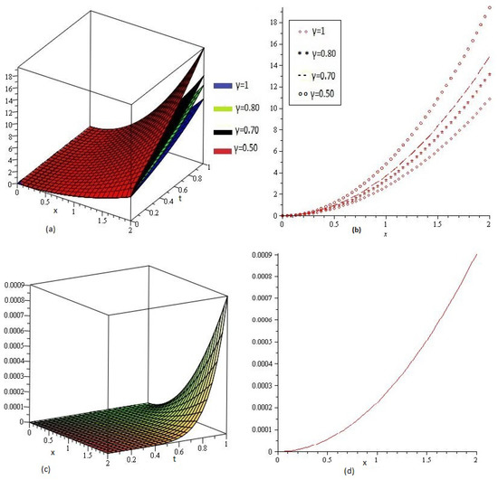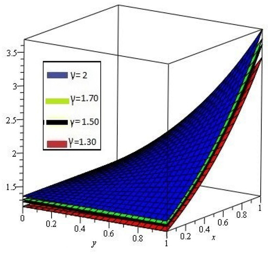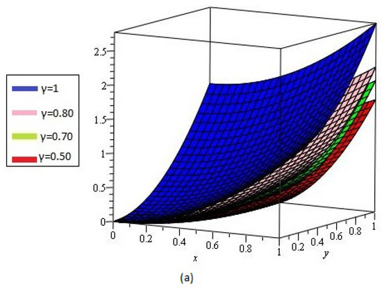 Figure 7a,b shows the behavior of obtained solution by the proposed method for different values of , , , and ; Figure 7c error plot for the range of x and y .