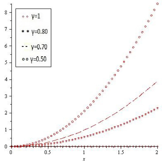 Comparison with numerical solution of by NTDM of Example 7, for different values of γ for .
