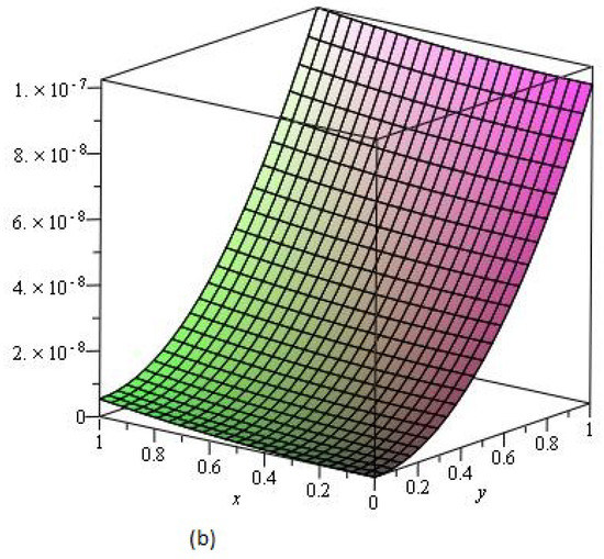 Figure 3a shows the behavior of obtained solution by the proposed method for different values of , , , and ; Figure 3b error plot for the range of x and y .