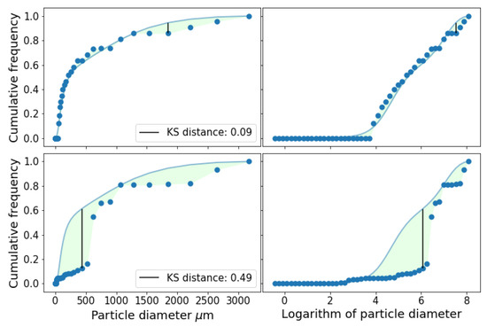 Actual (continuous line) and simulated (dots) PSD for soil 44. Top row shows the simulation using triplet , and m. On the left the x scale is the particle diameter in m, while on the right, for visualization purposes, it is on the logarithmic scale. For the bottom row, the input triplet used was , and m. In both cases, the maximum allowed distance for the acceptance of the KS test at a 0.05 level was 0.28.
