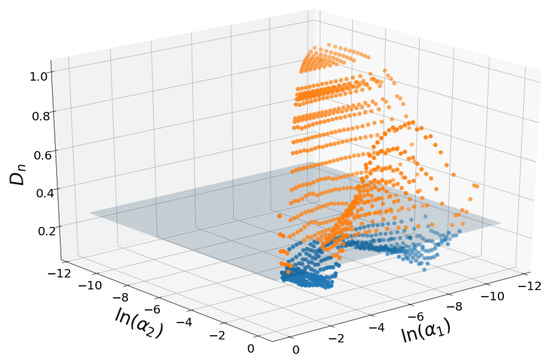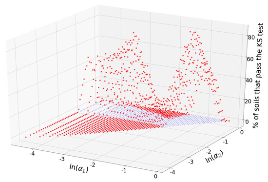 Representation of the KS distance, , for all possible triplets, in the plane, for soil 44. The values of are in the log scale. The horizontal plane, at height, 0.28, is the limit value for for the acceptance region at the 0.05 level. Blue points, below the plane, are the ones that passed the test, while orange ones do not pass it. For this soil, 403 triplets (37.28%) pass the test.