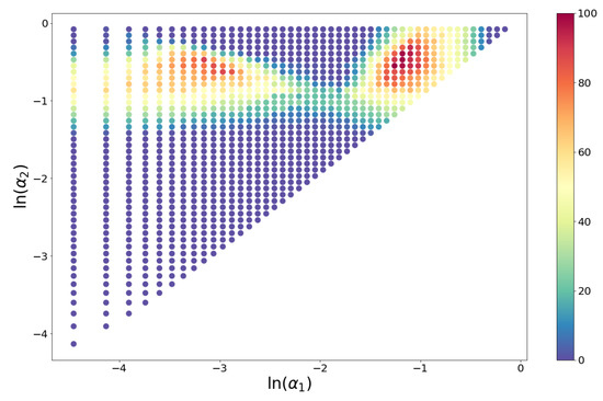 Triplets with maximum acceptance rates are concentrated in the neighborhood of the point , but there are other combinations of alpha values with relatively large acceptances. Figure 5 shows a heatmap of the acceptance percentage for the plane.