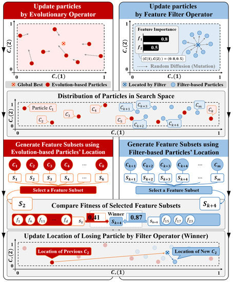 During the search process, the algorithm updates the membership of the losing particles with that of the winning particle, according to the tournament results based on the fitness value. This is shown in Figure 1. For example, if a filter-based particle wins, the filter operator’s search is regarded to be more effective than that of the evolutionary operator in the previous iteration. Thus, the algorithm applies the filter operator to the losing evolution-based particle in the next iteration. This procedure is repeated until the parameterized resources are exhausted.